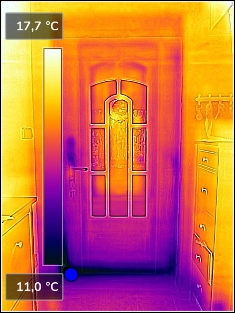 Vchodové dveře špatně izolují zejména ve spodní části, kde opět vidíme termokamerou masivní únik tepla. Rozdíly teplot jen na těchto dveřích přes 5°C.